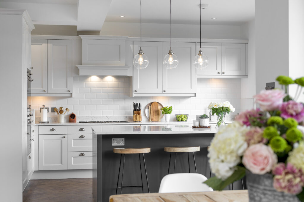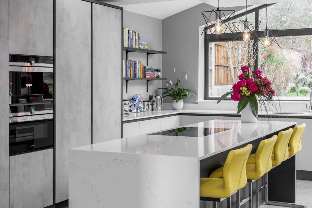 This project reconfigured the rear of the home into a spacious, light-filled open-plan environment for cooking, dining and relaxing. Large bi-fold doors connect the interior with the garden, while a generous island, peninsula seating and a characterful dresser create a bright, welcoming kitchen designed for everyday living and relaxed entertaining.